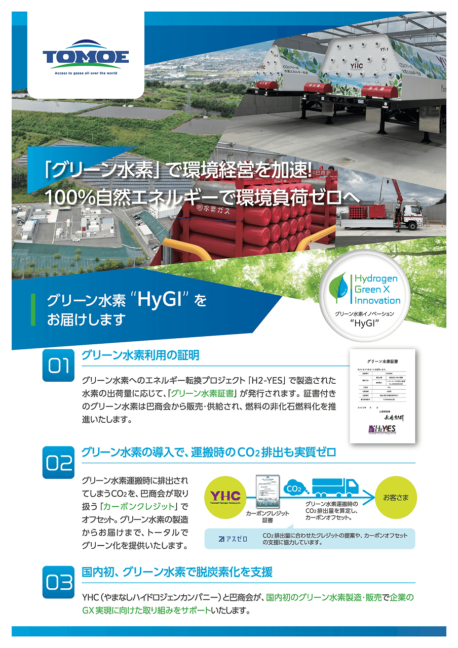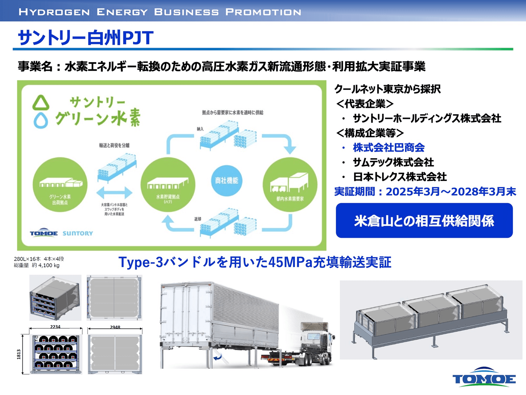パイプラインの整備されていない地域では、水素の供給に課題があり、ボンベのような容器で保管・輸送する必要がある。巴商会は、50年以上にわたり水素を供給してきた技術を活かして、地域内での水素調達・輸送システムの構築を進めている。